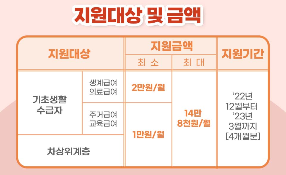 기초생활수급자와 차상위계층 세대에 22년 12월~23년 3월까지 사용한 난방비를 최대 14만 8천원까지 지급합니다.