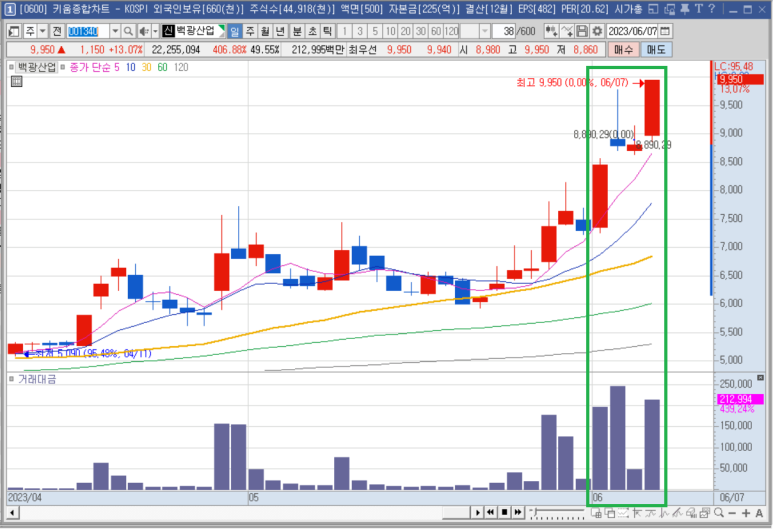 백광산업은 오늘 1차에 매도 되는 바람에 (매직스플릿) & 오늘도 많은 거래대금이 들어왔다 판단하여 포함했습니다.